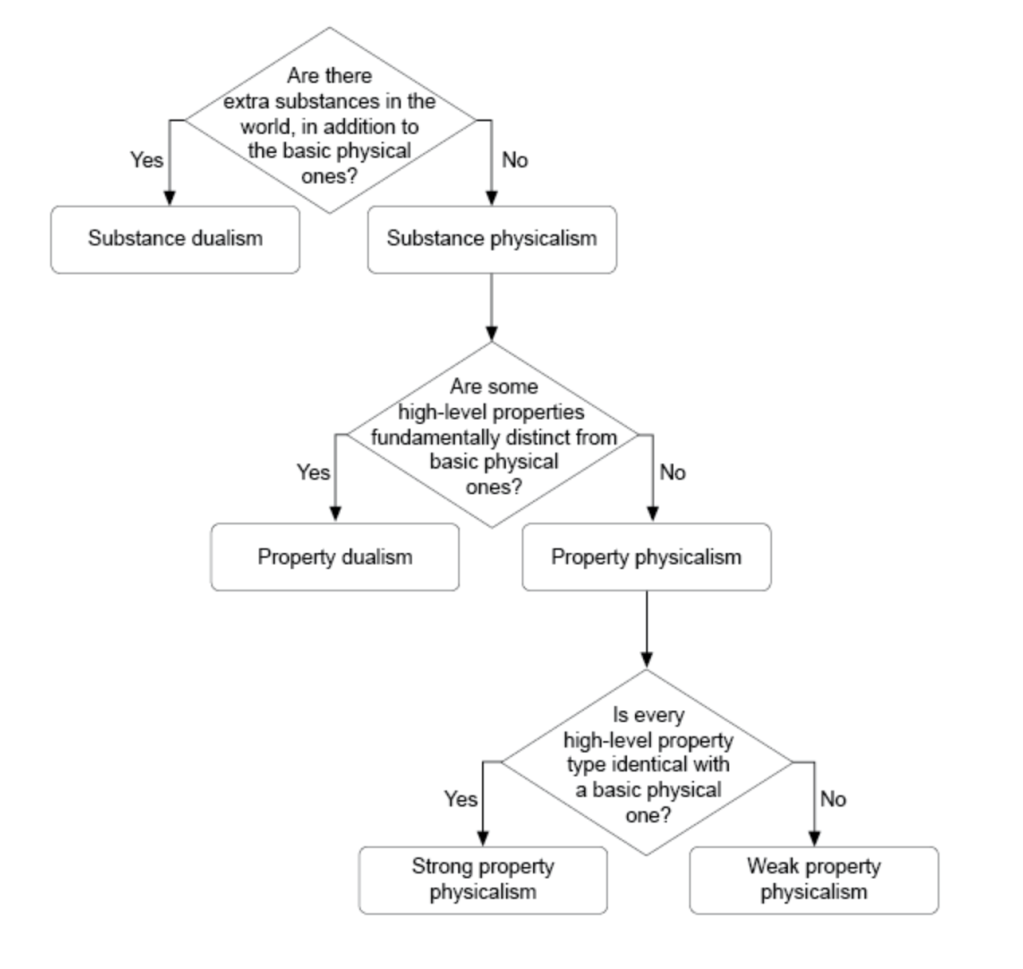 There are several theories in opposition to property dualism, one being substance dualism which is a more drastic stance that was taken by Renes Descartes and can be found in many religious traditions. This is the position that, as illustrated in the diagram below, there are two completely different substances making up the world. This second substance could be something like a soul. This theory is not as widely regarded in the philosophical or scientific community today, so we are going to focus more of our time on the broad category of physicalism within which there are several competing theories. It is important to note these do not cover all potential theories out there, supervenience, conscious realism, panpsychism, and idealism are some of many branches of and/or different theories out there that we will not cover in this paper, although my final thesis statement applies to them as well and I am partial to the conscious realism of Donald Hoffman myself.